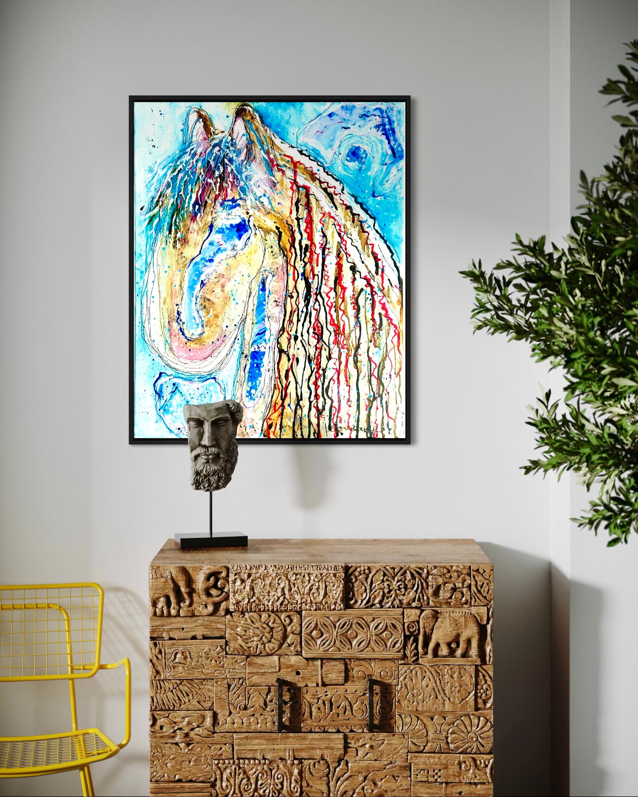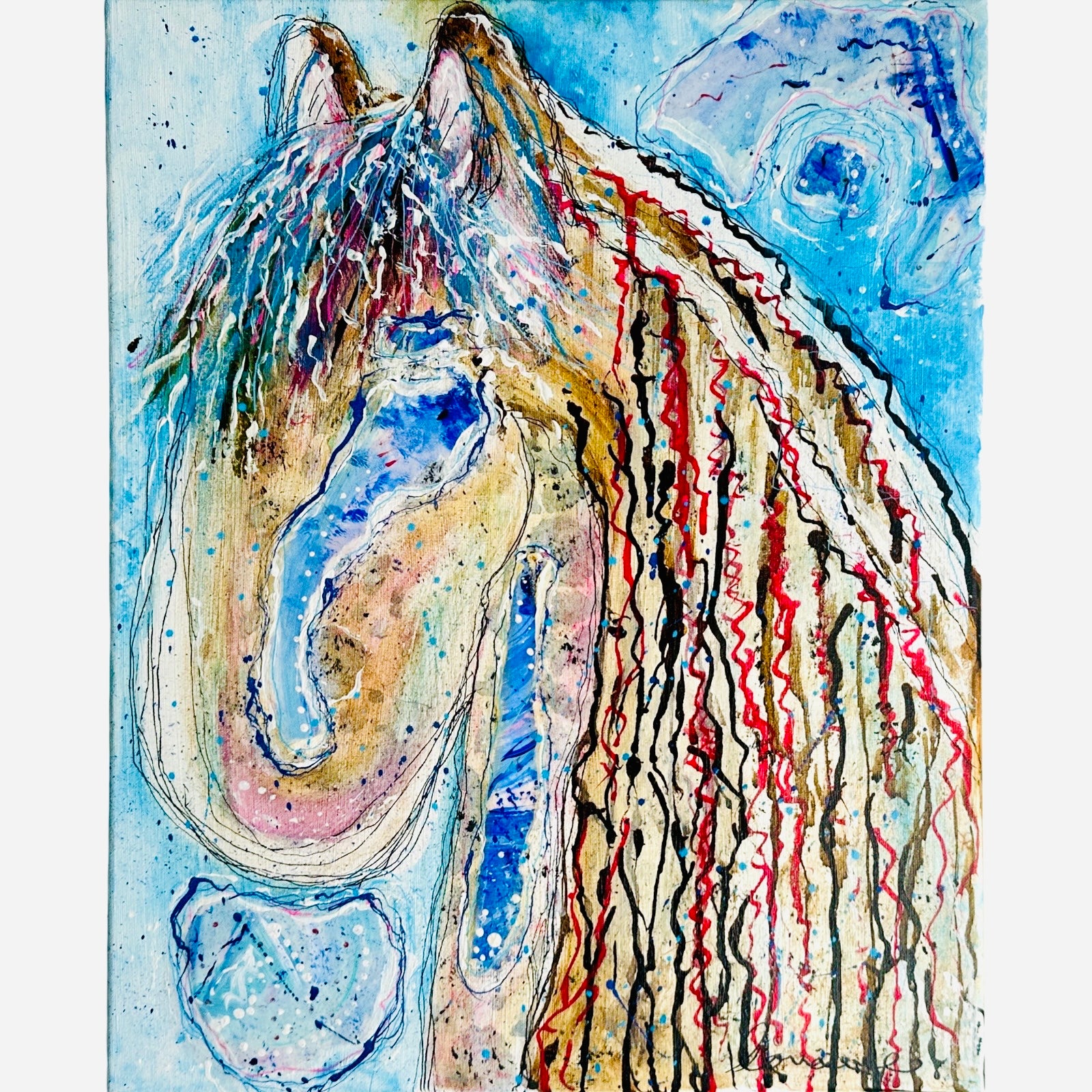 Step into a realm of magical whimsy with “Dream Weaver,” a captivating mixed media painting that merges soul and symbolism through color, texture, and movement. This ethereal portrait of a horse is rendered in a dreamlike palette of deep blues, soft pinks, and luminous whites, evoking the quiet mystery of twilight and the whispered edge of dreams. Hand-detailed with delicate pen and ink elements, the piece dances between the boundaries of realism and imagination, anchoring spirit to earth in the most tender of ways.