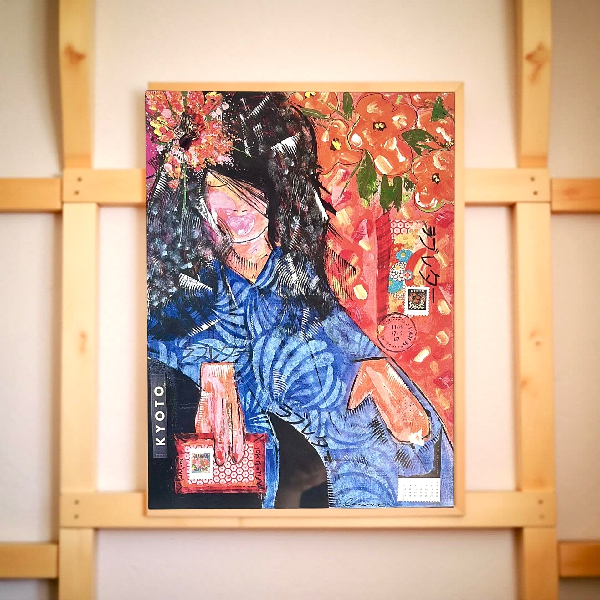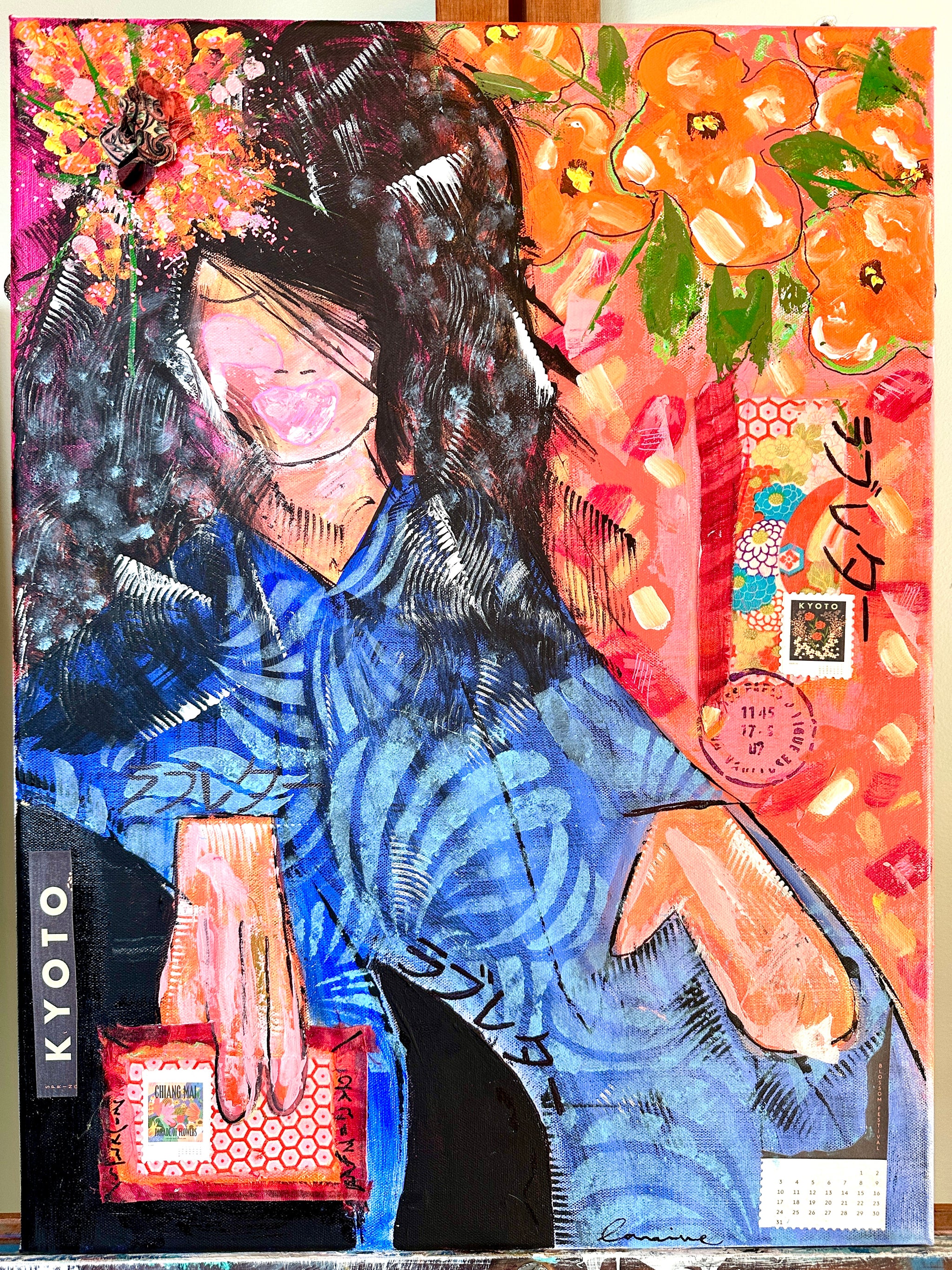 “Love Letter from Kyoto” is a reverent ode to quiet beauty, timeless tradition, and the gentle power of presence. In this piece, delicate layers of colour—blush pinks, misty blues, and vibrant shades of orange - echoing the serene grace of temple gardens and the fleeting poetry of sakura season. Fine pen and ink details dance like calligraphy across the canvas, inviting meditation, memory, and mindfulness.